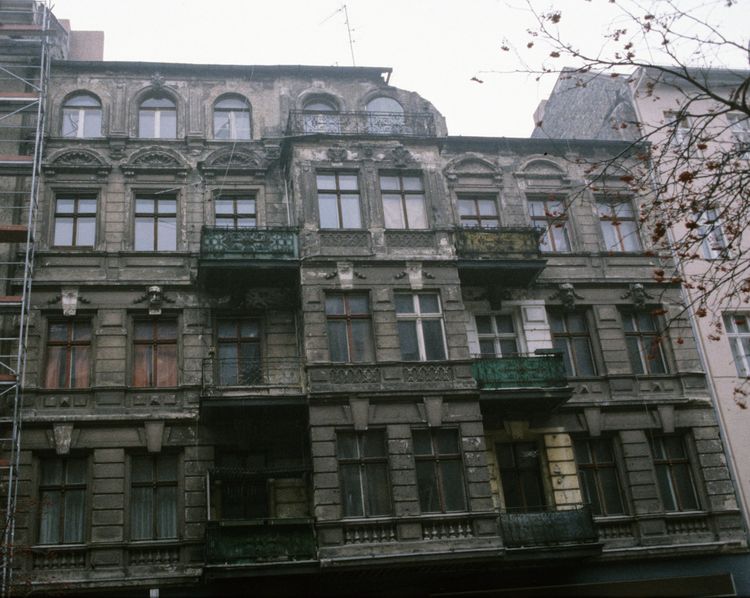 In der Mitte sieht man die Originalform, mit einer Einkerbung rechts oben um dort eine nette Terasse zu schaffen, und rechts daneben die gerade renovierte Form dann nach der Entfernung allen Stucks mit dieser in Berlin beliebten Hautfarbe. Links ging es auch gerade den Weg alles Irdischen. In den 20 Jahren 1980 bis 2000 wurde in Westberlin mehr zerstört und abgerissen als im zweiten Weltkrieg! Aufällig ist übrigens: der alte Verputz hielt 80 Jahre- der neue nicht mehr als 10. Merkwürdig.. |